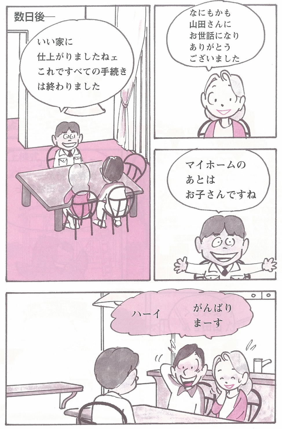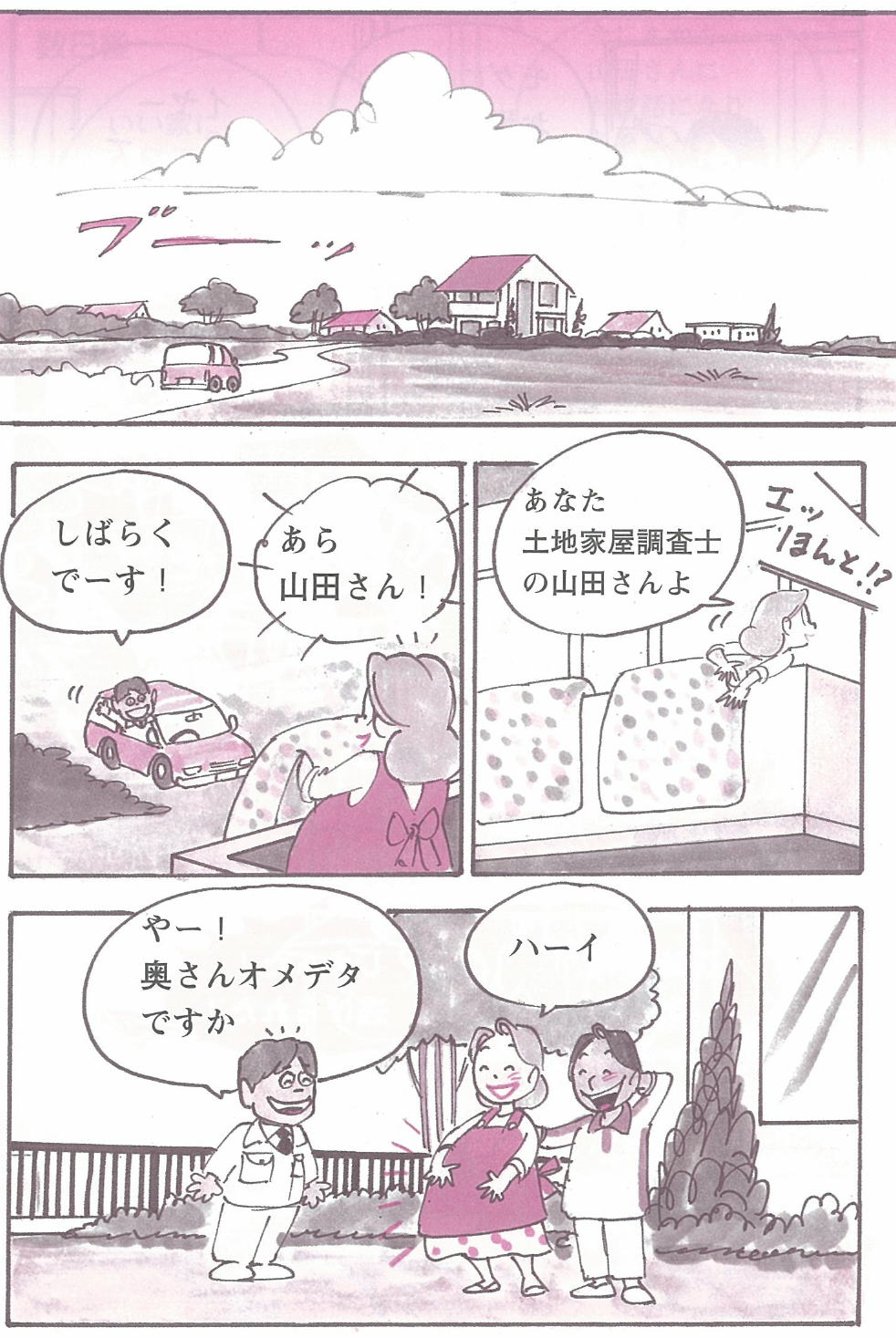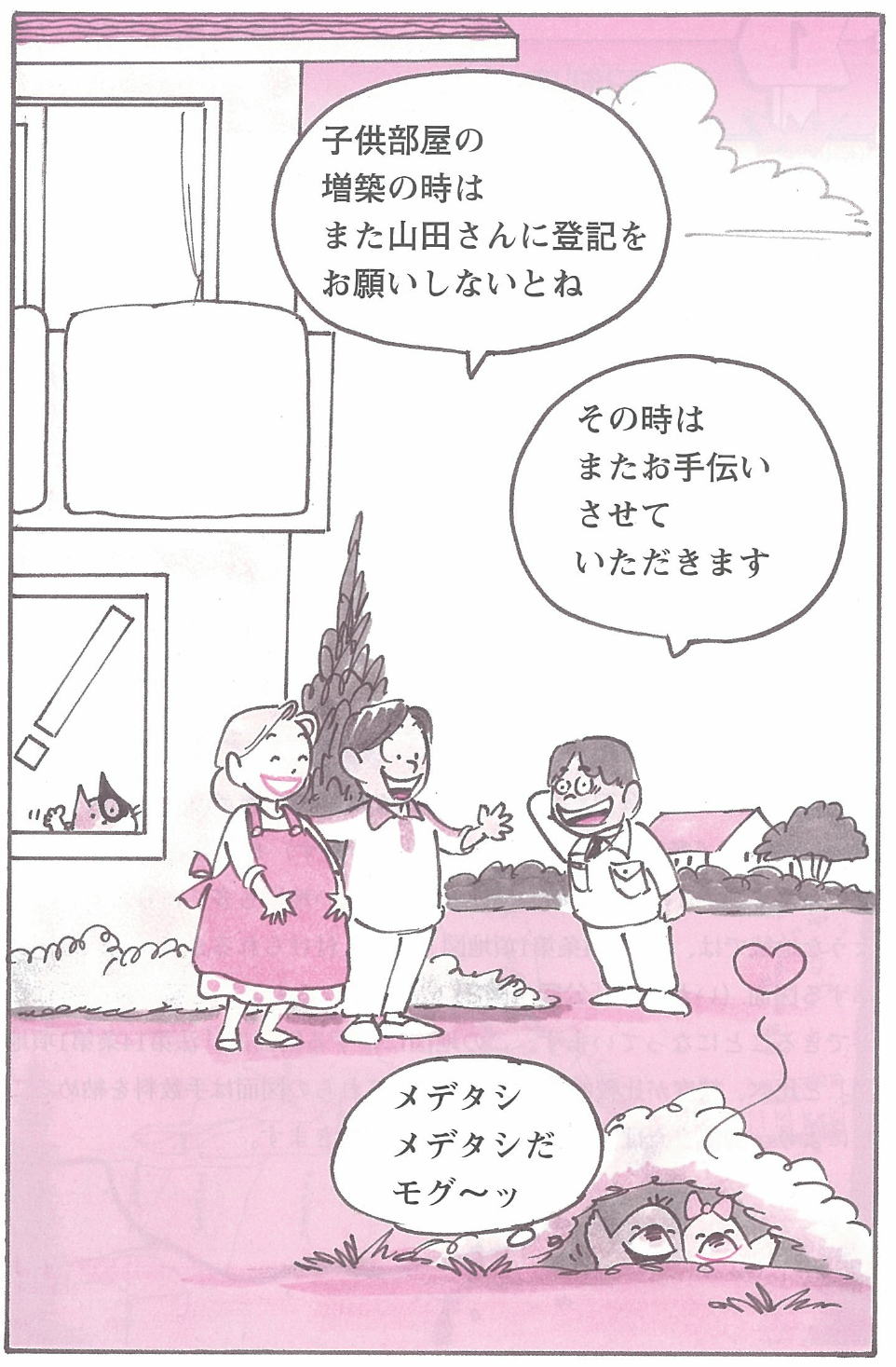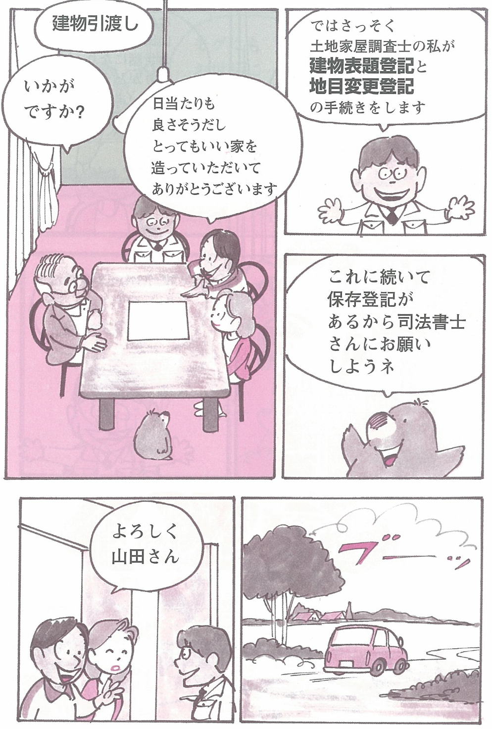 | ※大阪土地家屋調査士会の資料を基に作成しています。 ※通常、不動産事業者・司法書士・建築士・土地家屋調査士など各分野の専門家がほとんどの場合関わっています。 しかし、依頼したところを窓口として作業をするため、土地家屋調査士等の専門家を意識せず新居ができる時もあります。 このマンガは、土地家屋調査士に新居を依頼した場合を想定しています。 |